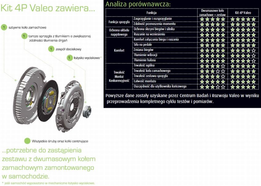 Części z serii Kit 4P Valeo cechują konkurencyjne ceny, w porównaniu do drogiej wymiany dwumasowego koła zamachowego wraz ze współpracującym zestawem.