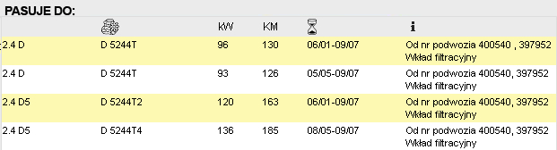 • Volvo V70 II 2.4 D 130KM *, 2.4 D 126KM *, 2.4 D5 163KM *, 2.4 D5 185KM * (06.2001 -> 09.2007)
