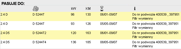 • Volvo V70 II 2.4 D 130KM *, 2.4 D 126KM *, 2.4 D5 163KM *, 2.4 D5 185KM * (06.2001 -> 09.2007)