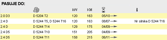 • Volvo XC70 II 2.0 D3 163KM, 2.4 D 163KM *, 2.4 D 175KM, 2.4 D5 205KM, 2.4 D5 215KM (08.2007 -> )
