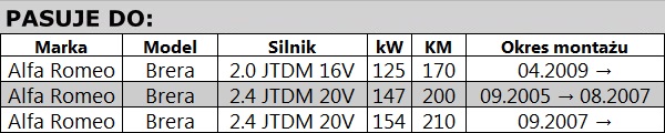 • Alfa Romeo Brera 2.0 JTDM 163KM, 2.0 JTDM 170KM, 2.4 JTDM 200KM, 2.4 JTDM 210KM