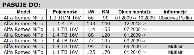 • Alfa Romeo Mito 1.4 TB 105KM, 120KM, 135KM, 155KM, 163KM, 170KM, 1.3 JTDM 90KM, 95KM