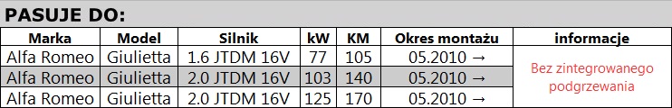 • Alfa Romeo Giulietta wszystkie typy Diesla bez zintegrowanego ogrzewania