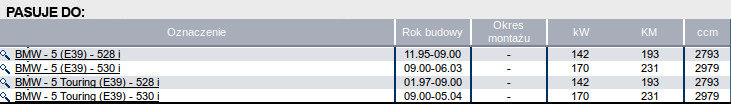 • BMW 5 [E39] 528 i 142kW 193KM (11.1995 -> 09.2000), 530 i 170kW 231KM (09.2000 -> 05.2004)