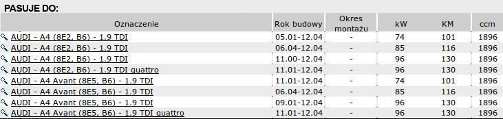 • Victor Reniz Audi A4 1.9 TDI 74kW 101KM (05.2001 -> 12.2004), 1.9 TDI 85kW 116KM (06.2004 -> 12.2004), 1.9 TDI 96kW 130KM (11.2000 -> 12.2004)