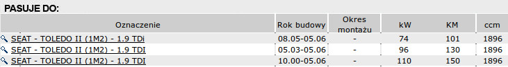 • Victor Reniz Seat Toledo II 1.9 TDI 96kW 130KM (05.2003 -> 05.2006), 1.9 TDI 110kW 150KM (10.2000 -> 05.2006)
