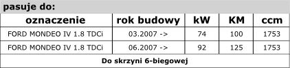 • Ford Mondeo IV 1.8 TDCi 74kW 100KM (03.2007 -> ), 92kW 125KM (06.2007 -> )