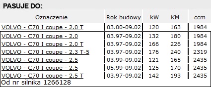 • Rozrząd kompletny Volvo C70 2.0 T 163KM, 226KM, 2.0 180KM, 2.3 T-5 240KM, 2.5 165KM, 170KM, 2.5 T 193KM. (03.1997->09.2002)