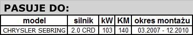 Jeśli chcesz zadbać o bezpieczeństwo w Chryslerze Sebring 2.0 CRD to przy wyborze filtra zdecyduj się na filtry firmy MANN. Są one przystosowane do nowoczesnych olejów o wysokiej wydajności i mogą sprostać nawet najbardziej wymagającym wyzwaniom technicznym. Ponadto filtry MANN można przystosować do montażu w różnych rodzajach silników.