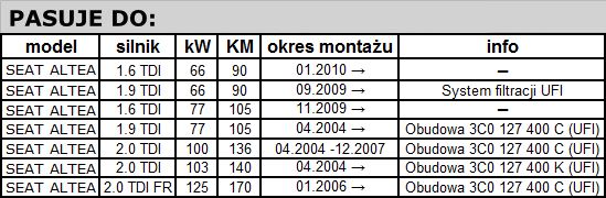 • SEAT ALTEA 1.6 TDI, 1.9 TDI oraz 2.0 TDI (04.2004 →)