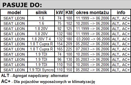 - Optymalny profil zapewnia płynny kontakt paska z kołem pasowym SEATA LEON 1.6, 1.8 20V, 1.8 20V T 4, 1.8 T Cupra R, 1.9 TDI oraz 1.9 TDI Syncro.