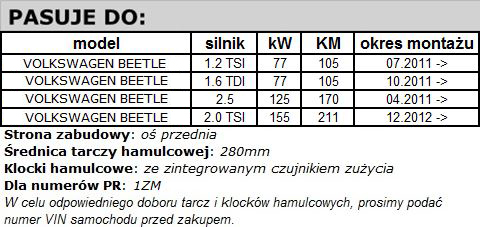 • Komplet tarcze + klocki hamulcowe SKODA VOLKSWAGEN NEW BEETLE 1.2 TSI, 1.6 TDI, 2.5 oraz 2.0 TSI (04.2011 ->)