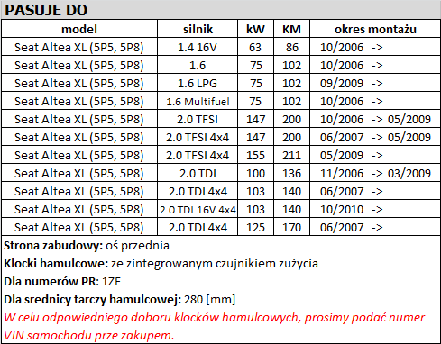 bezpieczeństwo i wyskoki komfort hamowania - również w modelu Seat Altea XL 1.4 16V, 1.6, 2.0TDI, 2.0TDI 16V 2.0TDI 4x4, 2.0TFSI.